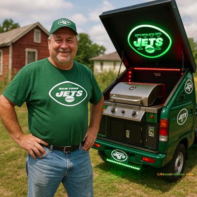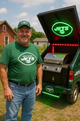 Meet the New York Jets tailgate king, a man who took his old mini truck — once used for hauling garbage — and turned it into a fully loaded grill-on-wheels. This thing’s got electric power, hydraulic lifts, LED lights, and a smoker that’d make a BBQ pitmaster jealous. Oh yeah, and he did it all himself.